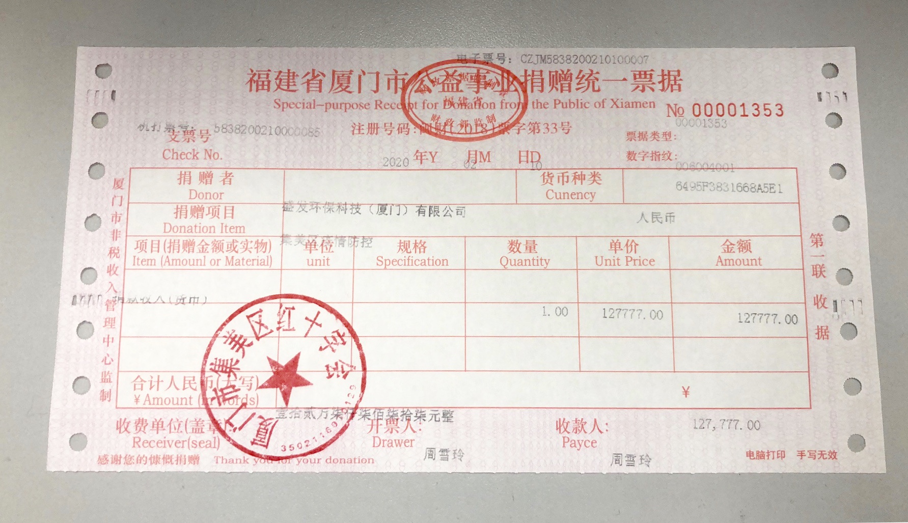 2020年的春節,一場(chǎng)突如其來(lái)的疫情,牽動(dòng)著(zhù)14億中國人的心,在這場(chǎng)戰“疫”中,沒(méi)有一個(gè)人是旁觀(guān)者,每個(gè)人都是戰斗者。在疫情爆發(fā)后,公司第一時(shí)間參與到疫情防控的工作中,董事長(cháng)馬明軍個(gè)人通過(guò)相關(guān)慈善機構款5萬(wàn)元現金,用以購買(mǎi)防控疫情物資支援疫情前線(xiàn)。同時(shí)組織召開(kāi)公司總裁辦會(huì )議,決定由公司出資10萬(wàn)元支援廈門(mén)本地抗擊疫情,盛發(fā)黨支部書(shū)記郭新勝與工會(huì )主席邱國紅組織黨員干部及員工進(jìn)行捐款捐物,在短短2個(gè)小時(shí)內共籌得善款27777元,以上善款合計127777全額捐贈給廈門(mén)市集美區紅十字會(huì ),用于疫情嚴重區域及本地疫情防控物資購買(mǎi)。